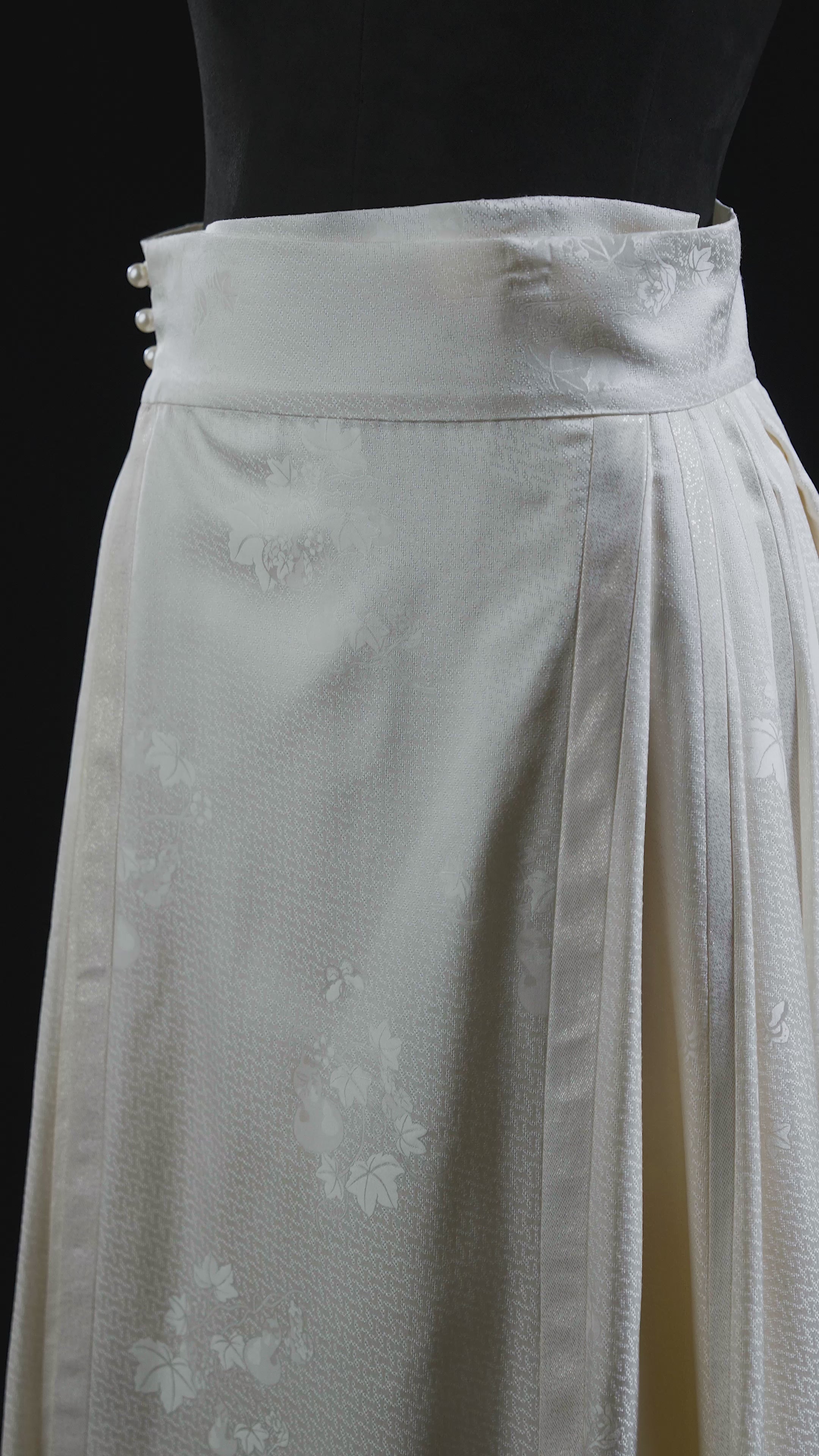 As the skirt flares, it resembles a gentle brushstroke on a canvas, outlining the contours of time. We present to you a silk Jin embroidery "Zhaojun Goes Beyond the Great Wall" horse face skirt. This garment is crafted from silk known for its soft pearl luster and smooth texture, allowing the embroidered patterns to come to life in vivid detail.